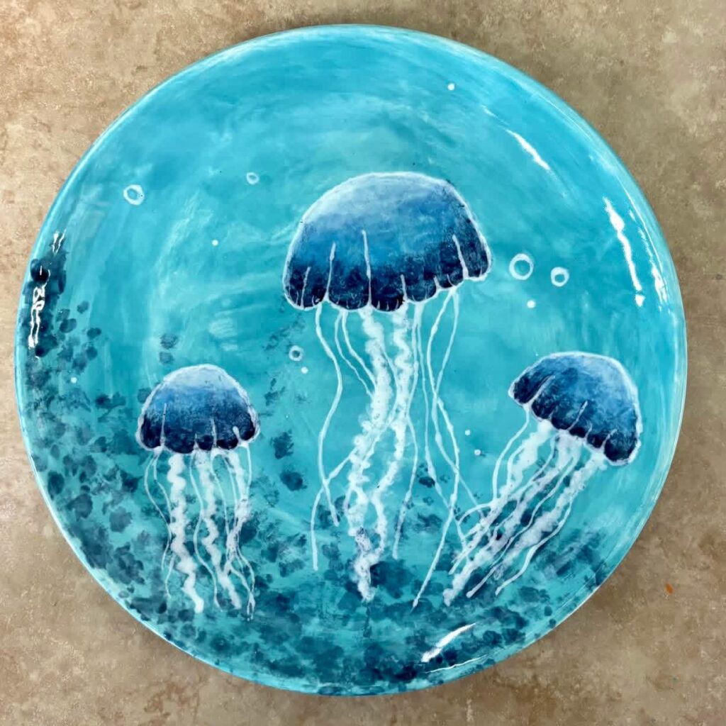 After you’re finished painting your piece, we allow it to dry completely before we apply clear glaze to half your piece. When that is dry, we apply clear glaze to the other half. When this is dry, it waits its turn to go into the kiln to make your piece bright, shiny and food-safe. It will be in the kiln for approximately 24 hours. Then, we need to sand and match up your piece(es) to have them ready for you to pick-up.